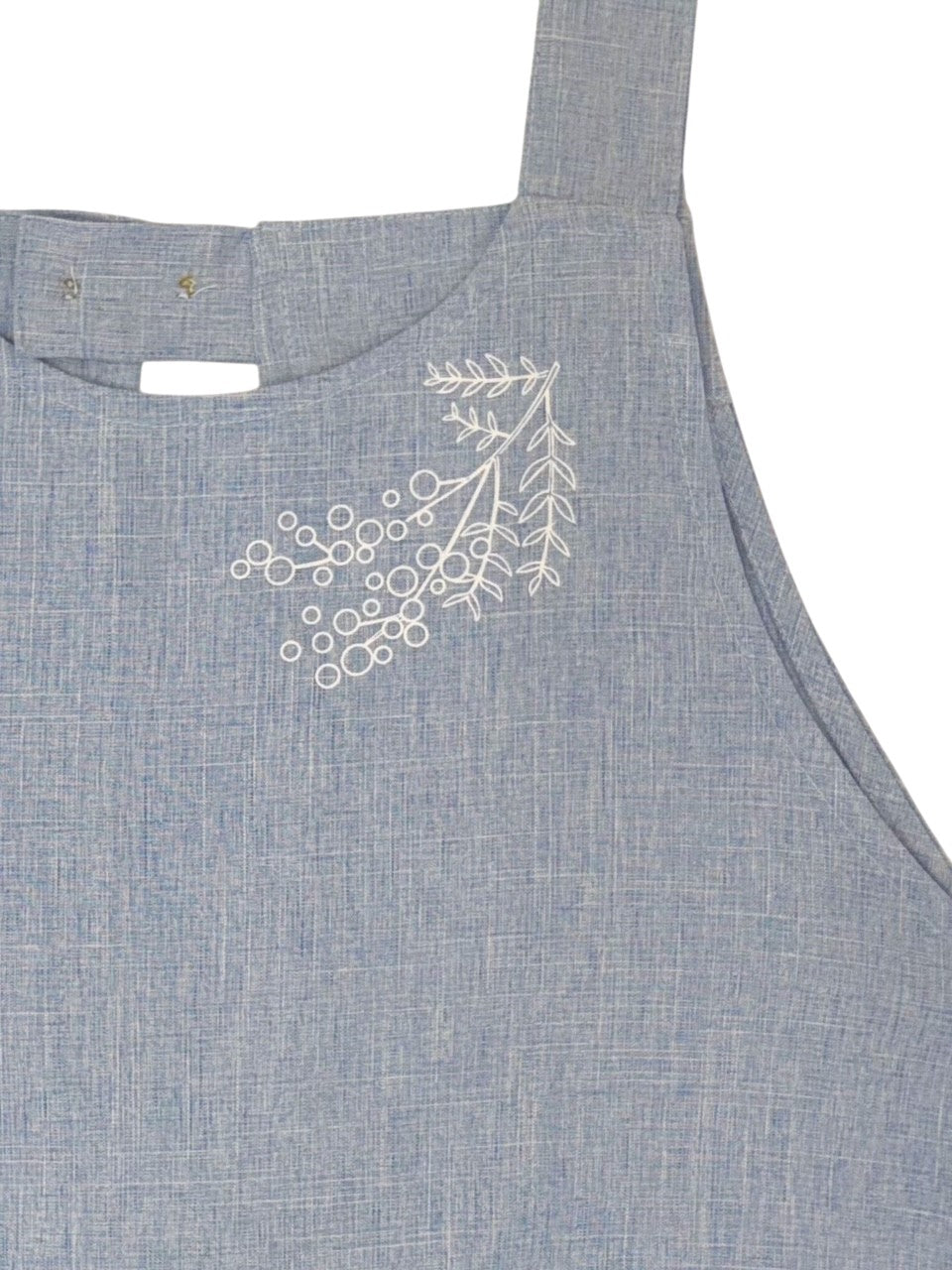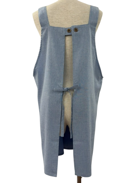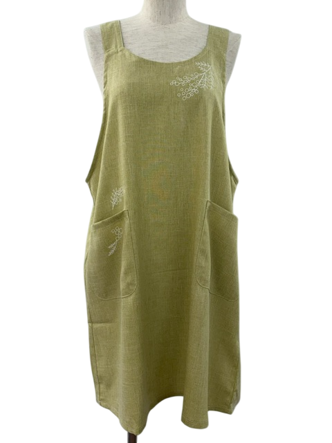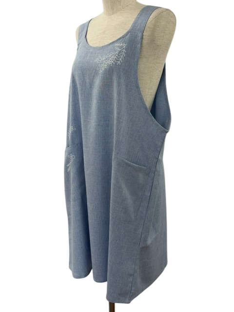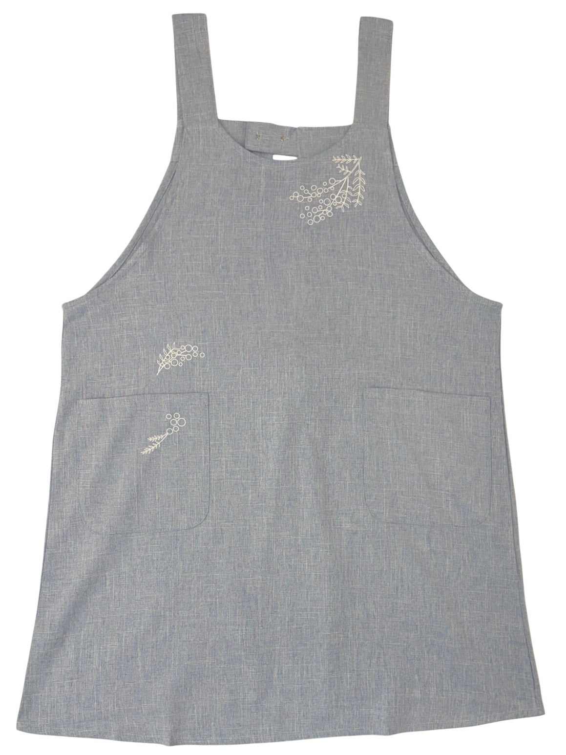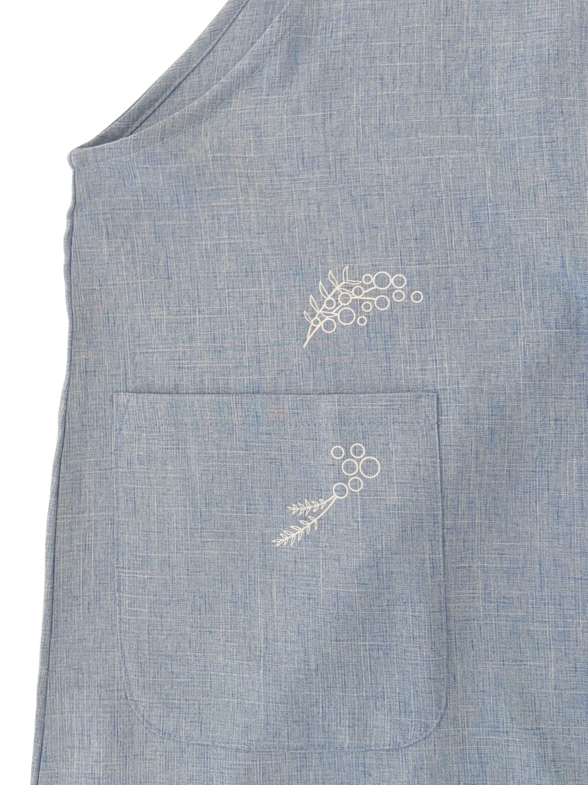 胸とポケットにミモザのプリントが入ったシンプルなエプロン。綺麗な色味と落ち感のあるシルエットがポイントです。着脱丈75cm