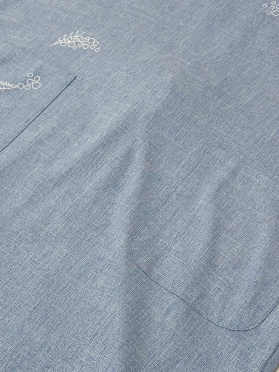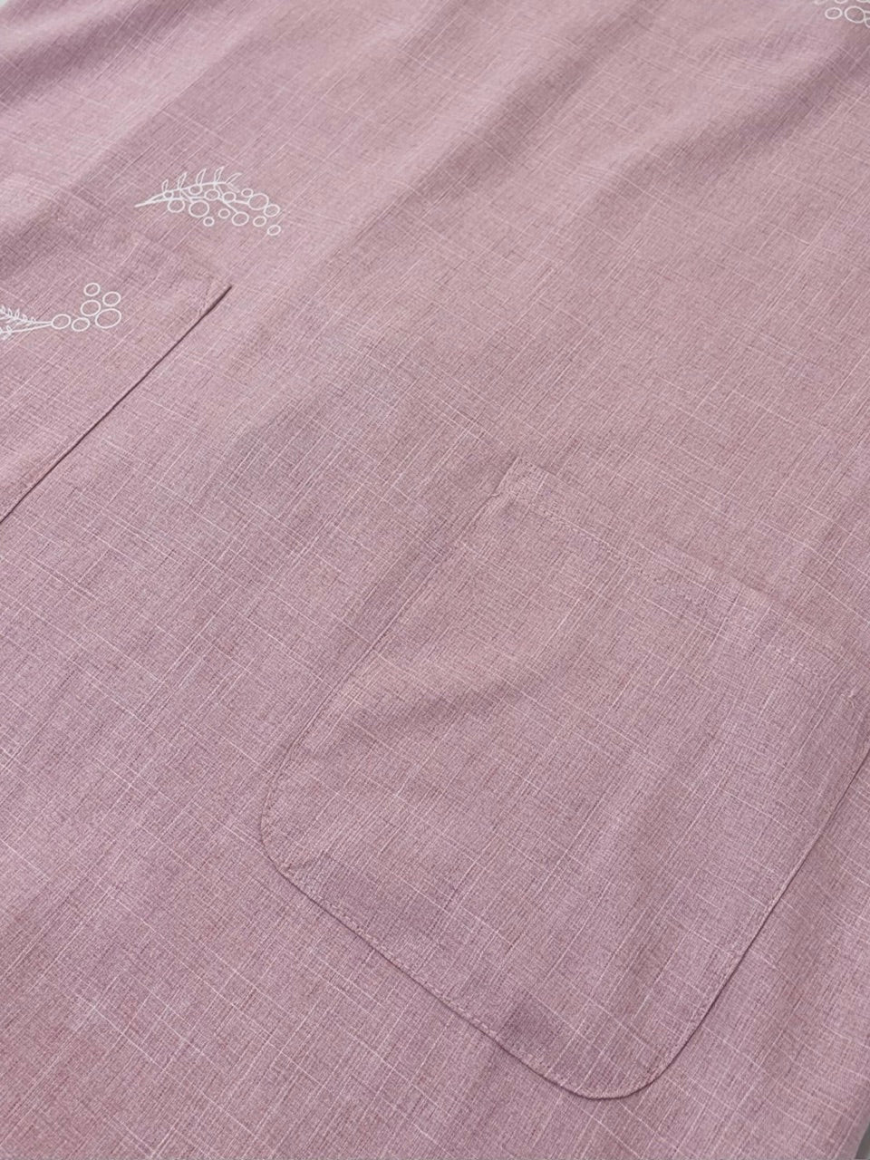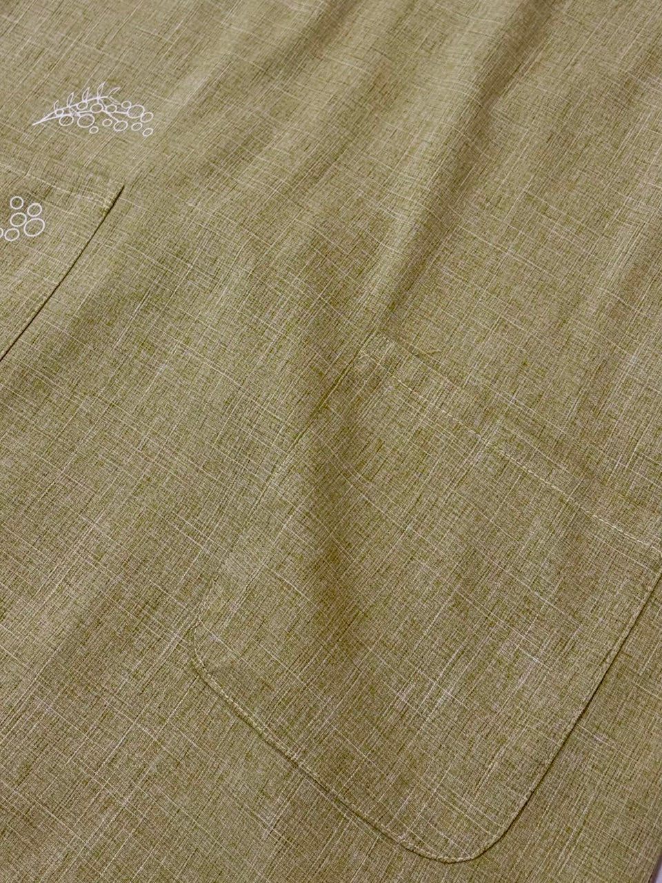 胸とポケットにミモザのプリントが入ったシンプルなエプロン。綺麗な色味と落ち感のあるシルエットがポイントです。着脱丈75cm